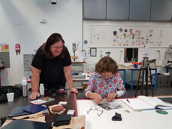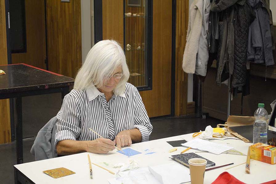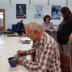 Het is altijd spannend om emaille te combineren met een ander medium. Tijdens de workshop Tekenen met oliepastel hebben wij onder begeleiding van Annemarie Timmer geëxperimenteerd met het combineren van emaille met olie pastel. De techniek is in theorie eenvoudig, maar zoals elke nieuwe techniek is oefening nodig. Een schoon plaat vóórgeëmailleerde staal of schoon koper wordt met een haardroger goed verwarmd. Vervolgens word erop met oliepastel een tekening gemaakt. Het zou ook met vetkrijt kunnen, maar oliepastel werkt beter. Daarna wordt er een laag vloeibare emaille aangebracht, bijvoorbeeld met een kwast. Dan drogen en branden. Op de plekken waar er oliepastel is trekt het emaille natuurlijk weg. In de hete oven smelt het oliekrijt, dus wat je na afloop ziet is de tekening (in de kleur van de ondergrond) en het emaille. Dit kan meermaals herhaald worden. Deze techniek kan uiteraard gebruikt worden ook op een niet platte ondergrond – zoals bijvoorbeeld een schaal. Dit biedt dan weer andere mogelijkheden.