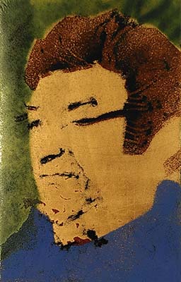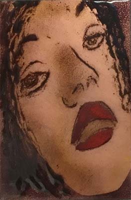 We zijn begonnen, na het aanbrengen van de contra emaille, met een laag fondant. Daarna, de contour van ons portret uitgeknipt en als sjabloon gebruikt om eromheen het achtergrondkleur(en) te strooien. Natuurlijk, steeds tussendoor gebrand. Vervolgens werd het haar aangebracht, opnieuw door van de rest van het gezicht (met wat ruimte eromheen) een sjabloon te maken, en na branden is de rest van het gezicht gestrooid en gebrand. Als laatst kwamen de details: voorzichtig de wenkbrauwen, en delen van de ogen, neus, mond uitgeknipt, en gestrooid.