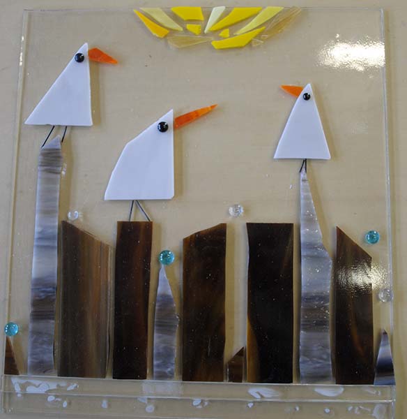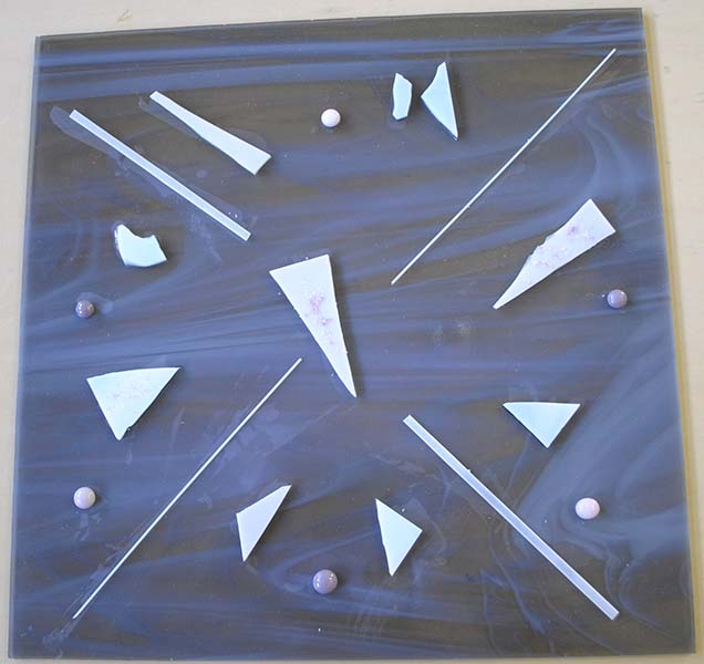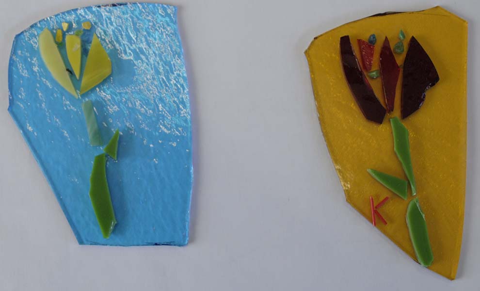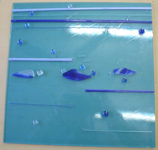 Iedereen ging aan de slag en er waren weer veel verschillende ideeen. De bedoeling was om stukjes glas te snijden en deze in een patroon op de glasplaat te leggen tot je een afbeelding had die helemaal naar je zin was. Daarna plak je de afbeelding vast met behanglijm om te voorkomen dat het werk ging schuiven tijdens het overbrengen naar de oven. Je kon kiezen tussen full fuse (hierbij zakt de afbeelding in het glas) en tack fuse (hierbij blijft het patroon iets op het glas liggen).