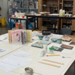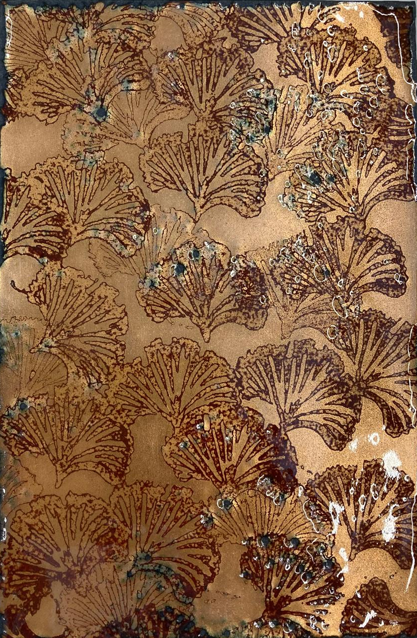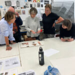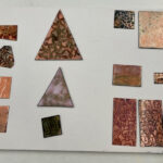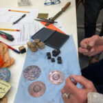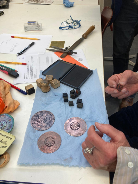 Christine demonstreerde hoe stempels uit gum gemaakt kunnen worden. De deelnemers gebruikten ook stempels van thuis, waaronder standaard stempels uit de winkel en thuis gemaakte linos. De techniek is als volgt; Je stempelt met inkt, poedert het emaille op de inkt en klopt het emaille weer af, vervolgens brand je het werkstuk. Met deze techniek kun je snel een verrassend en herhaalbaar effect behalen. Het werkt het beste als je dit direct op het koper doet en minder met een onderlaag van emaille. Het gebruik van stempels geeft de creaties een unieke diepte wat kenmerkend is voor emailleren en met geen andere techniek zoals schilderen te bereiken is. De combinatie met high firing, gebruik van stempels en de interactie met oxiderend koper geeft uitdagende en spannende resultaten.